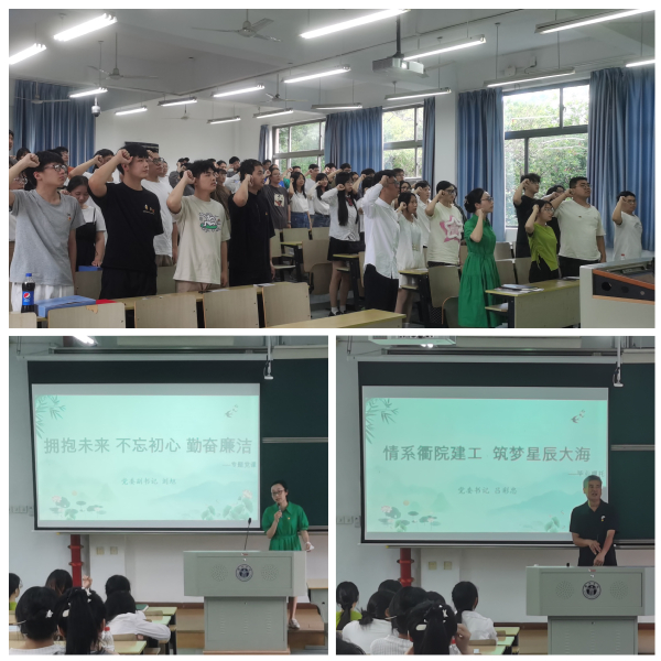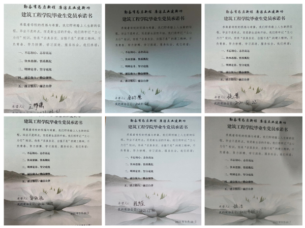 大会在庄严肃穆的国歌声中拉开序幕。建工学院党委书记吕彩忠老师对圆满毕业的同学们表示祝贺,对即将走向社会的毕业生党员提出了五点要求:一要端正思想、二要摆正态度、三要注重细节、四要放大格局、五要常修品德,并嘱托毕业生党员在新的岗位上继续用踏实的态度、炙热的情怀展现建工学子的风采,充分发挥党员的先锋模范作用。 毕业生党员代表18建筑陈宣燕、19土木张玺瑞、19工管沈倩、21工管专升本王嘉乐分别围绕“勇敢”、“成长”、“坚定”、“奋斗”四个关键词做了精彩分享,他们从自身出发,讲述发生在自己身上的衢院故事,并结合自身经历,为即将起航的毕业生党员们送上祝福,勉励大家用满腔热情拥抱时代,为国家建设做出建工人更大的贡献。 建工学院党委副书记、纪委书记刘旭为毕业生党员上“拥抱未来 不忘初心 勤奋廉洁”专题党课。刘旭老师从勤廉学院及勤廉党支部建设要求讲起,对即将走上工作岗位和继续攻读研究生的毕业生党员提出三点希望:一是勇于拥抱未来,调整好心态,积极应对离开母校后生活、事业等周围环境的改变;二是不忘入党初心,做一个有坚定政治信仰的人,正确处理好个人与集体的关系;三要勤奋做事、廉洁做人,始终不放松政治理论学习和专业技能提升,以自身的学识和本领为团队贡献力量,争做勤奋担当、锐意进取、正气充盈的新青年。党课学习后,全体毕业生党员签订了“勤廉”承诺书。
